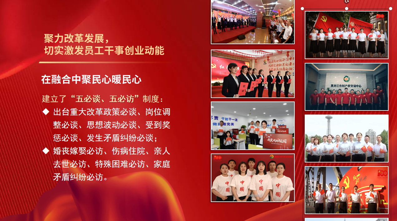 集團(tuán)黨委還引導(dǎo)黨員員工開展自主教育,組織開展“四愛四創(chuàng)”主題思想教育、“提質(zhì)增效、黨員先行”主題實(shí)踐活動(dòng)和“我為集團(tuán)發(fā)展獻(xiàn)一策”建議征集活動(dòng),充分激發(fā)員工“主人翁”意識(shí),通過發(fā)揮思想政治工作統(tǒng)一思想、凝聚共識(shí)的重要作用,推動(dòng)集團(tuán)不斷實(shí)現(xiàn)高質(zhì)量發(fā)展,龍江全面振興全方位振興貢獻(xiàn)了平臺(tái)力量。